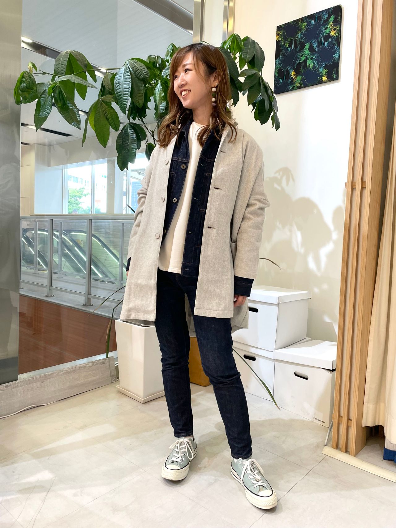 Gジャンの上から着用しているのはSETTOの”SJK1001L23 / MARKET JACKET”人気のマーケットジャケットのデザインで秋冬仕様のコットンツイード生地で、サッと羽織れる1着!
