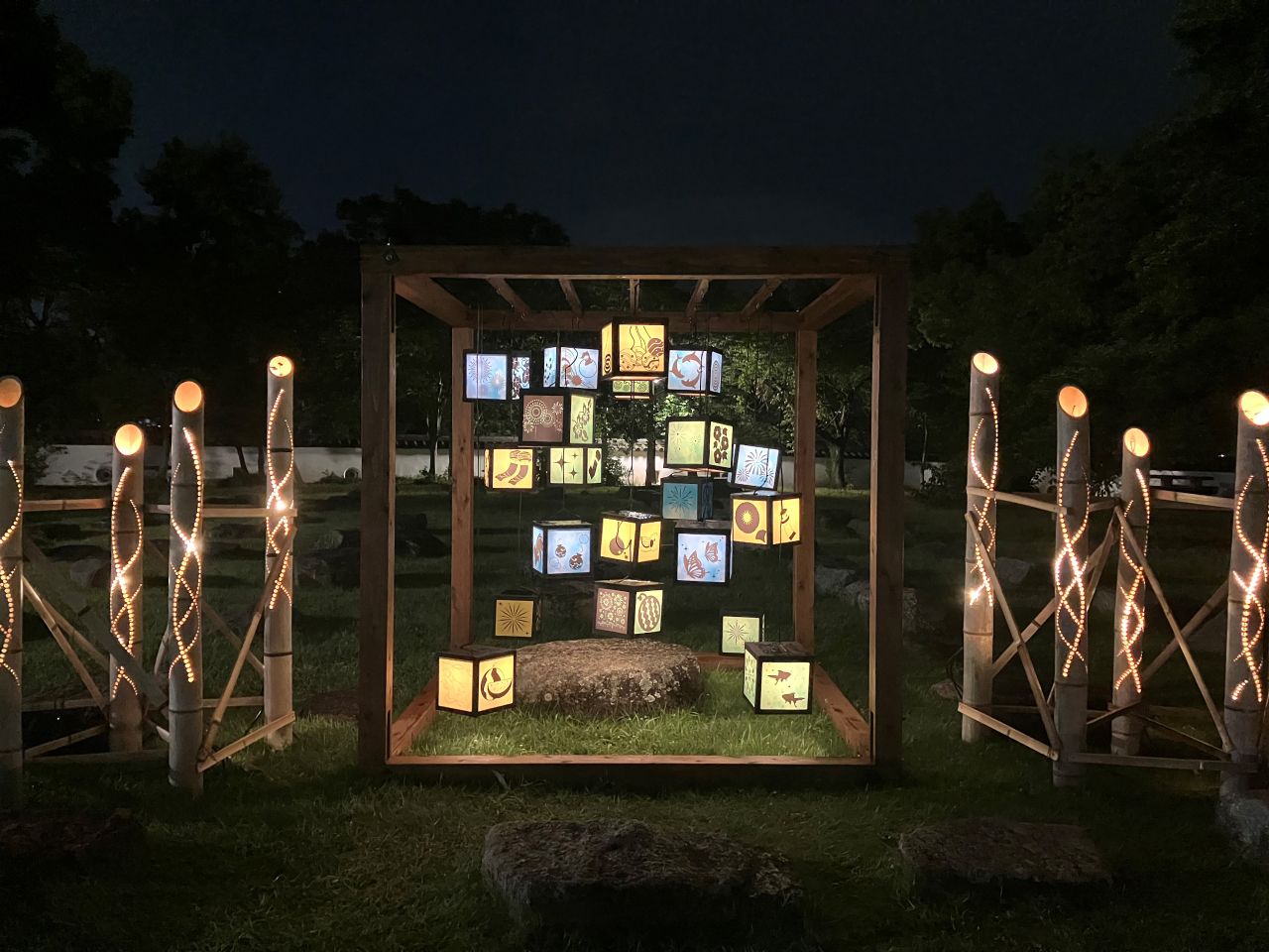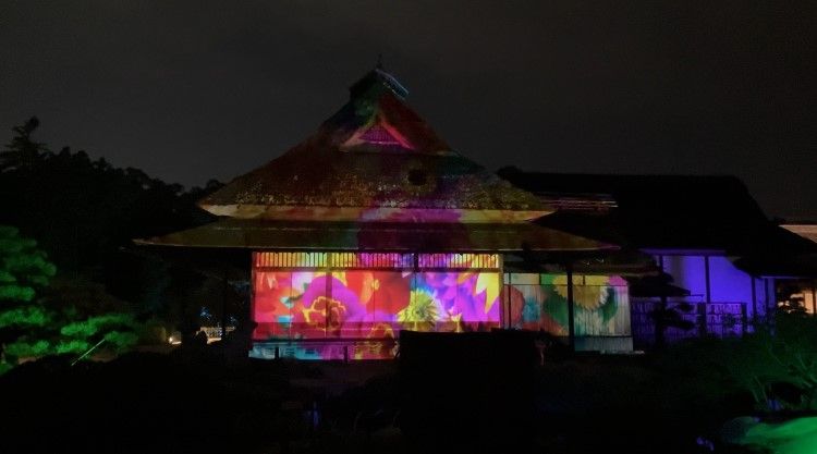 まず入り口を抜けると様々なライトアップがされていて、少し進むと日本家屋の壁に映し出されたプロジェクションマッピングが音楽とともに流れていてとても綺麗でした。