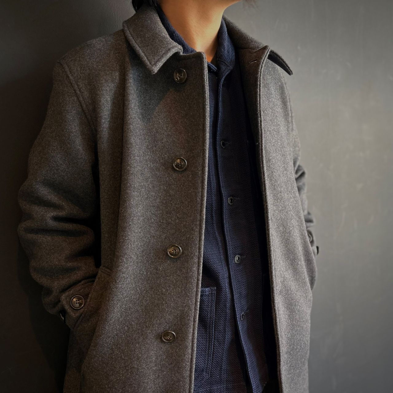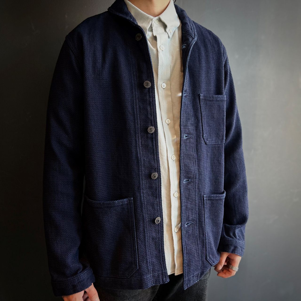 ドビー織、インディゴ染の落ち着いた生地感に対して、この黒ボタンはより全体をシックにまとめてくれるアイテムへと昇華させます。